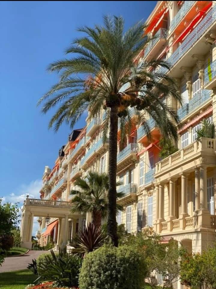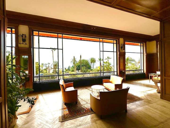 Depuis ses deux terrasses, la vue imprenable sur une rangée de palmiers crée une ambiance typique de la Côte d’Azur.